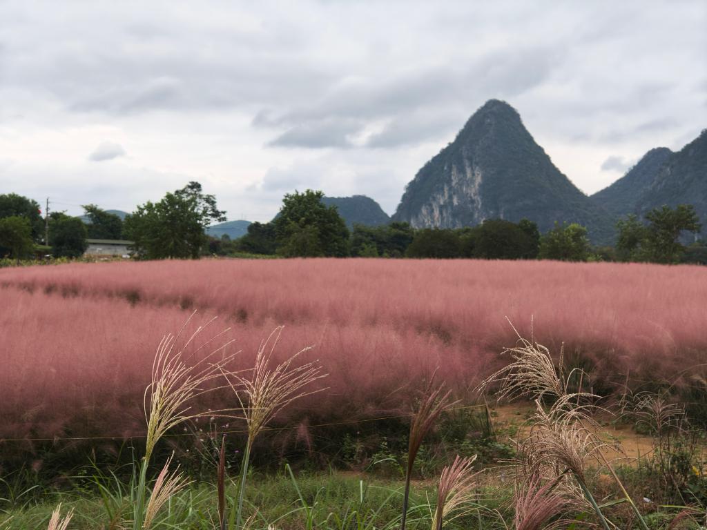 此刻的花海格外绚烂,整片的粉黛乱子草毛绒蓬松、似絮如风、云雾般的粉色唯美浪漫,与之相辉映的还有向日葵、格桑花、红高粱……