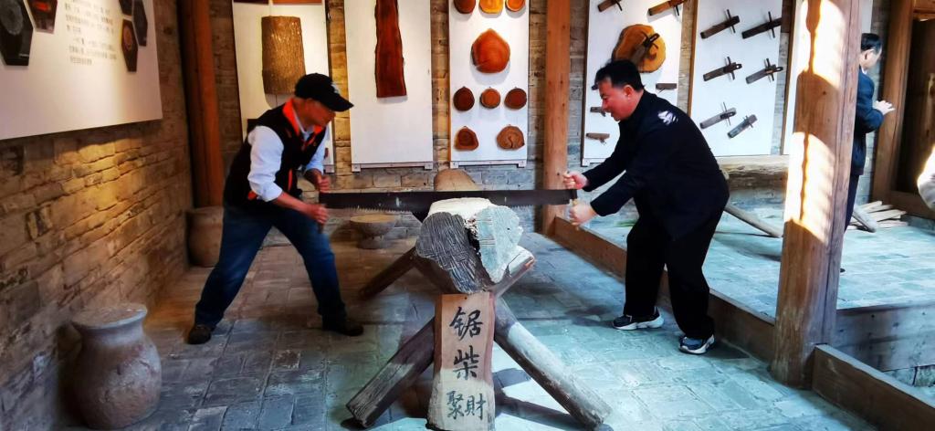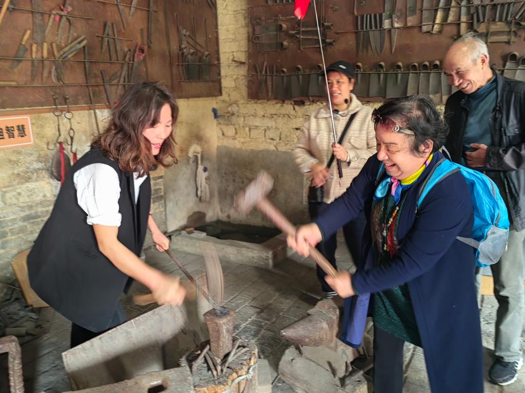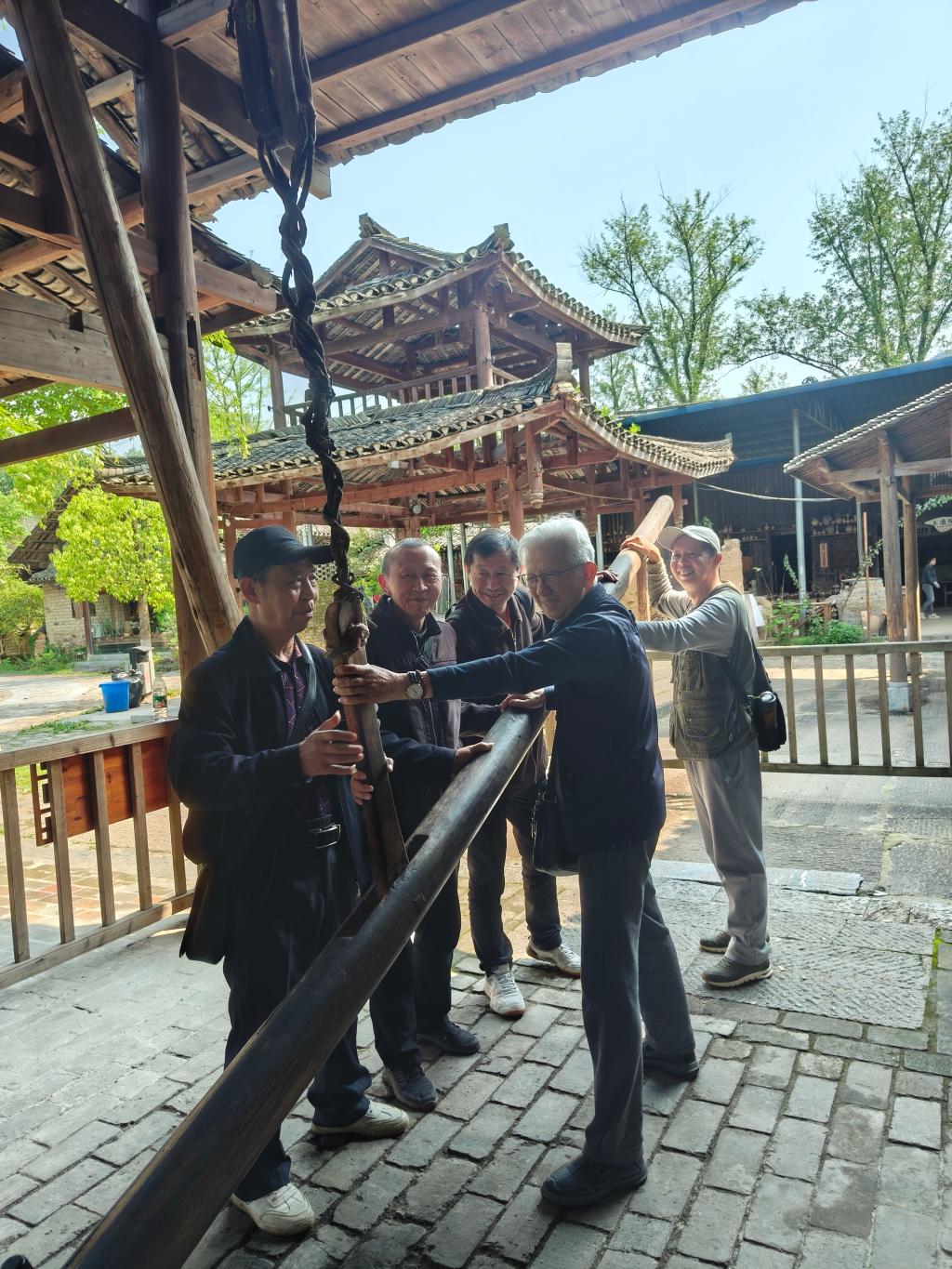 四月的古村,绿柳含烟、屋宇错落,老同志们紧跟讲解员脚步,了解到了桂北民俗、民间工艺、古村民居等,走过潮田河上的铁桥,就有豆腐坊、酒坊、打铁坊、油榨坊、水车、古桥等各式村景,作坊里制作的食品,土味十足,老同志品的品,尝的尝,买的买。最吸引老同志的还是油榨坊,你看,师傅抱起榨油柱,老同志们轮流协助,喊着号子,非常起劲。