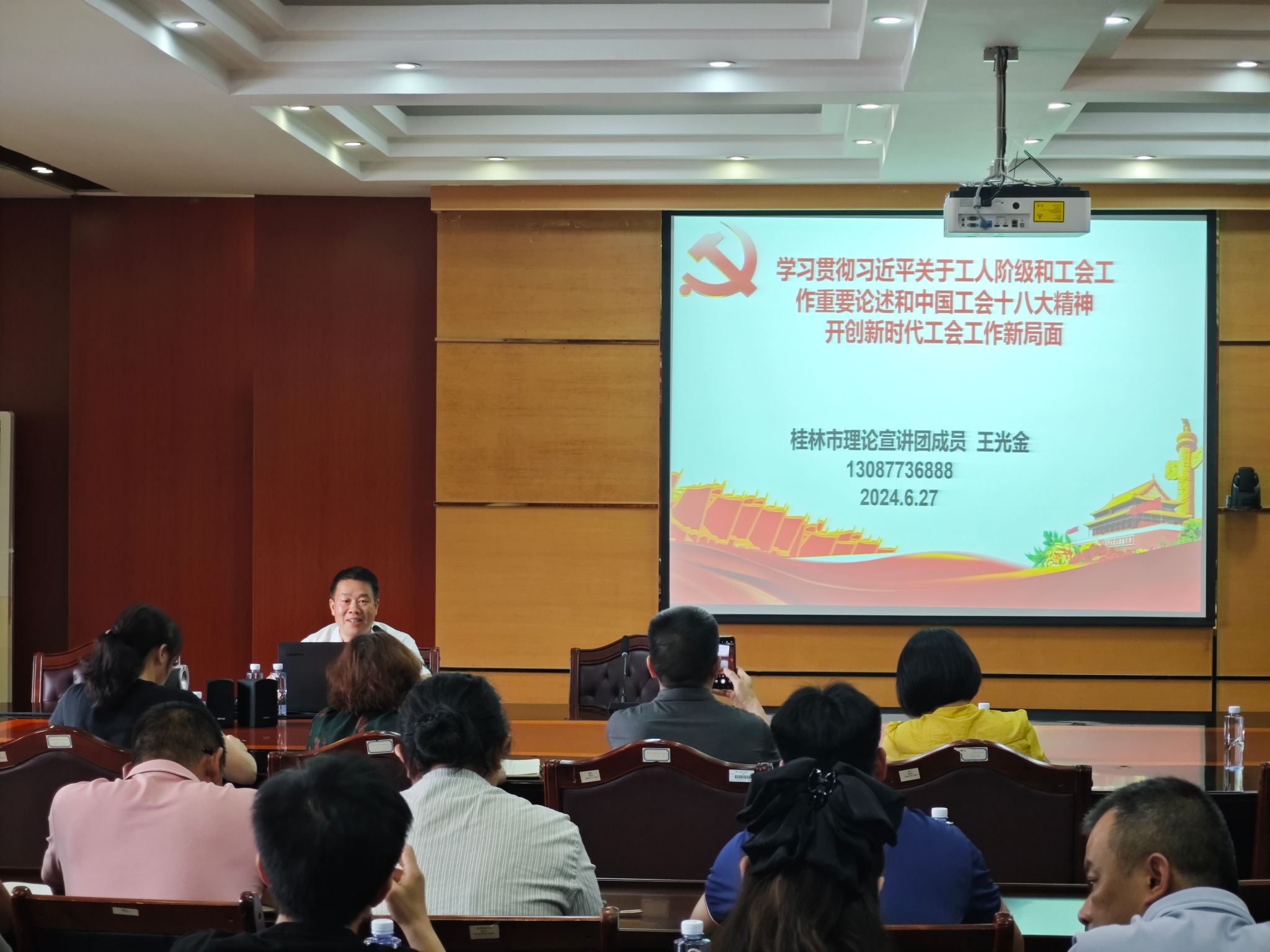 本次讲座特邀请原桂林市总工会二级调研员、桂林市教育工会主席、市职工大学客座教授王光金老师作《深入学习贯彻习近平总书记关于工人阶级和工会工作的重要论述和中国工会第十八次全国代表大会精神,开创新时代工会工作新局面》专题讲座。